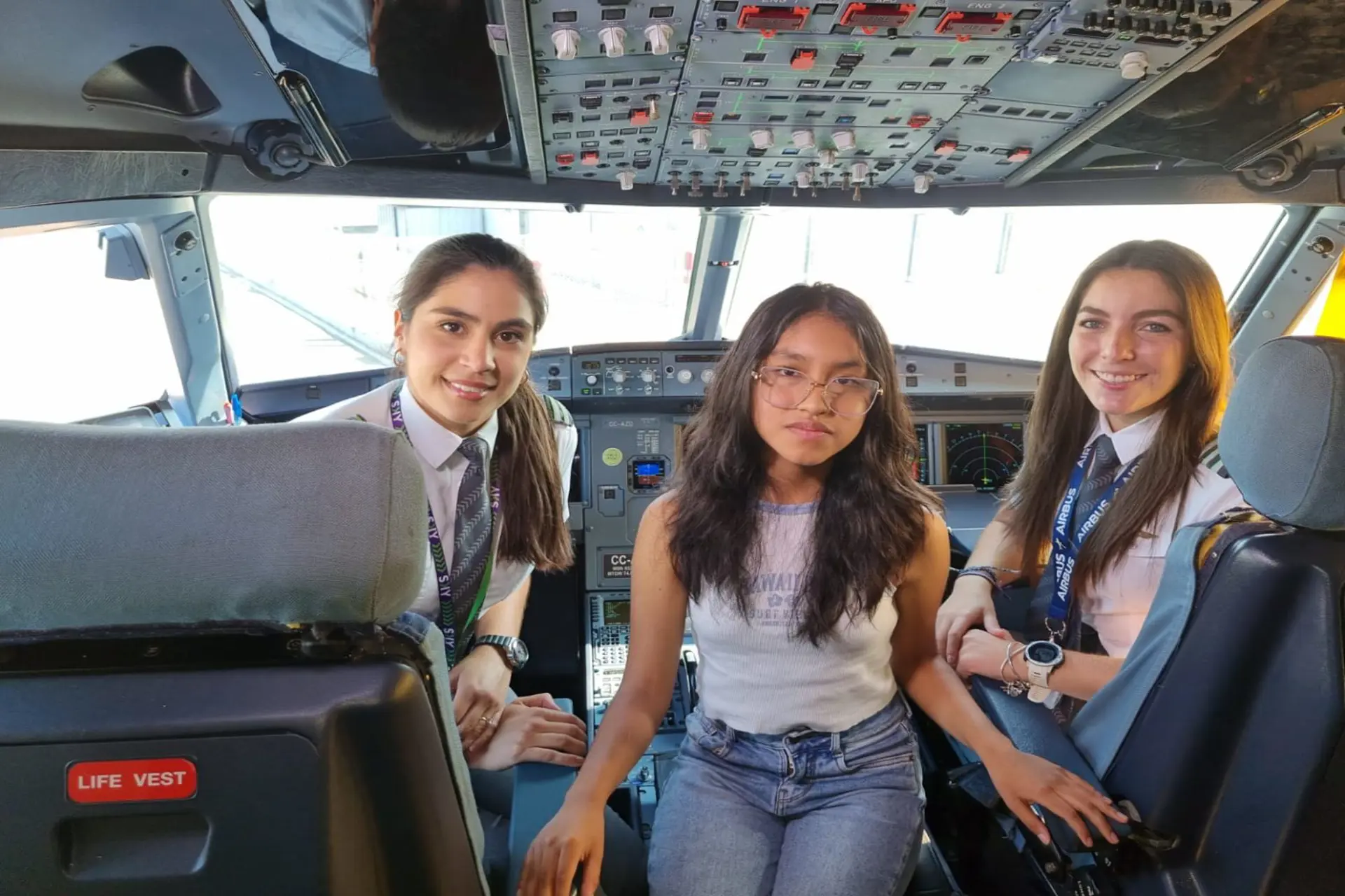 En ese vuelo, también fue invitada una niña de 13 años de la Escuela Gabriela Mistral de Lima interesada en temáticas STEM (Ciencia, Tecnología, Ingenierías y Matemáticas), para que conociera de cerca a la tripulación de SKY y de esa forma, contribuir a derribar prejuicios y estereotipos sobre carreras asociadas a un género específico.