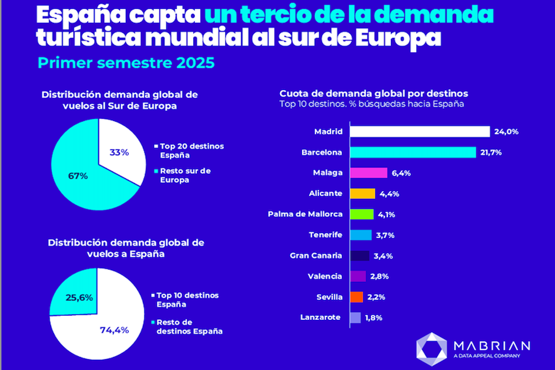 España reafirma su posición como líder mundial en turismo, captando el 33% de la demanda turística mundial al sur de Europa durante el primer semestre de 2025, según el último análisis realizado por Mabrian, la plataforma global de inteligencia turística, parte de The Data Appeal Company- Almawave Group. Destinos clave como Madrid, Barcelona y las Islas Canarias continúan atrayendo visitantes internacionales durante todo el año, lo que demuestra el papel vital de España en el impulso del crecimiento sostenible del turismo en la región.