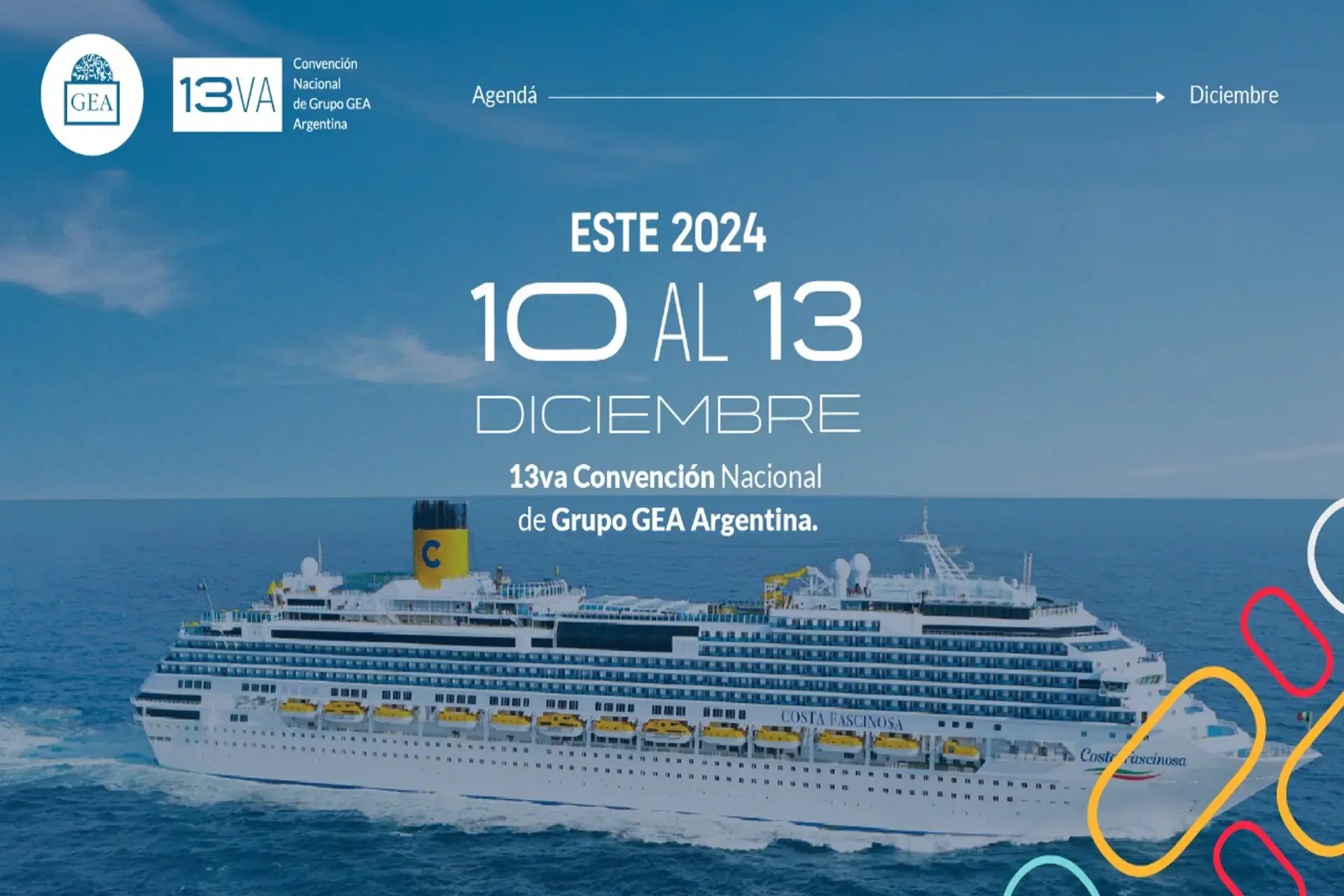 La 13va Convención Nacional de Grupo GEA, un evento emblemático que se llevará a cabo del 10 al 13 de diciembre de 2024 a bordo del crucero Costa Favolosa, el martes 10 de Diciembre.