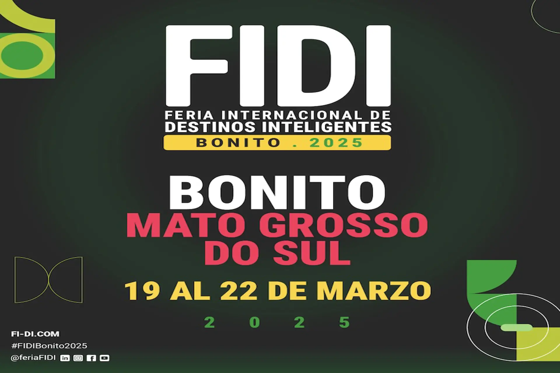La Feria Internacional de Destinos Inteligentes (FIDI) 2025 se celebrará del 19 al 22 de marzo en la hermosa Ciudad de Bonito, Brasil, un destino mundialmente reconocido por su ecoturismo y su impresionante belleza natural. Bajo el lema “ECOTURISMO INTELIGENTE, SALUDABLE Y SEGURO”, la FIDI promete ser un punto de encuentro único para líderes, empresas, expertos y emprendedores del turismo global, quiénes compartirán y debatirán sobre las últimas tendencias y estrategias para construir destinos turísticos más sostenibles, accesibles e innovadores.
