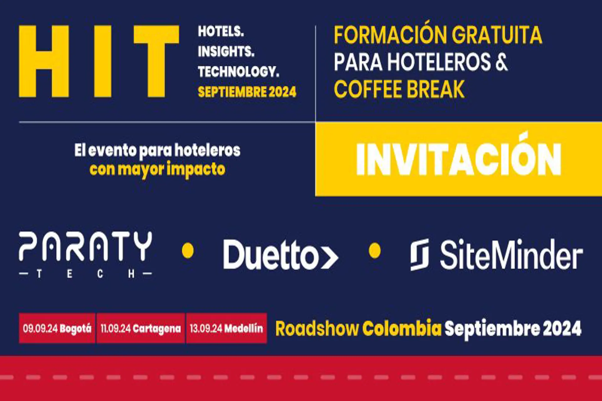 Tras el éxito cosechado en otras regiones, Paraty Tech (motor de reservas), SiteMander, Duetto, anuncian su Roadshow Colombia 2024. El evento, consistente en una serie de jornadas de formación gratuita y networking coffee-break exclusivo para hoteleros, bajo el lema “ HIT'24 / Hotel, Insights & Technology".