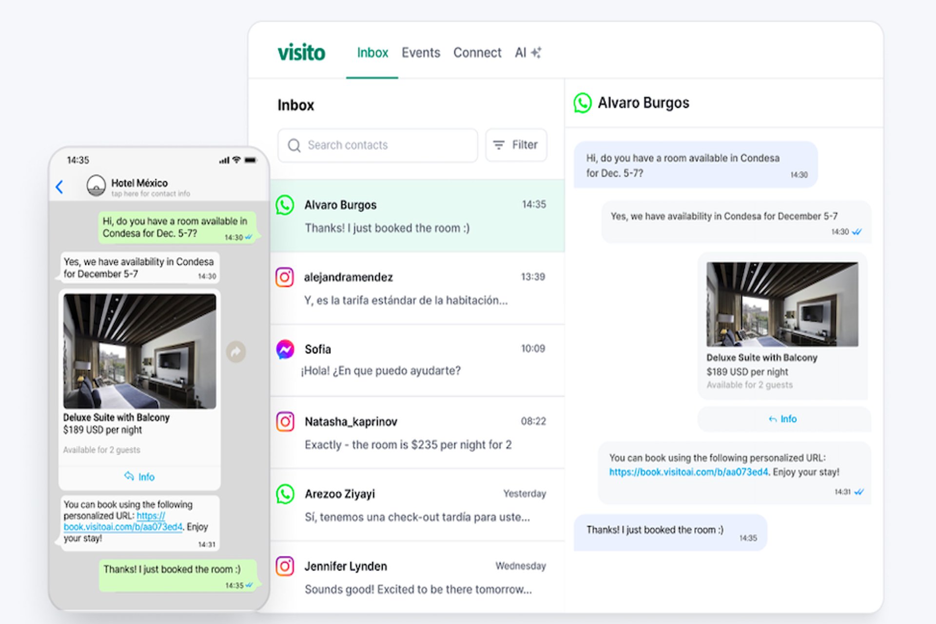 Visito capacita a los hoteles para resolver el 97% de los mensajes de los huéspedes a través de canales populares como WhatsApp, Instagram y Messenger. Al reducir el esfuerzo manual y los costes operativos, la plataforma ofrece mejoras sustanciales de eficiencia al tiempo que eleva la satisfacción de los huéspedes.