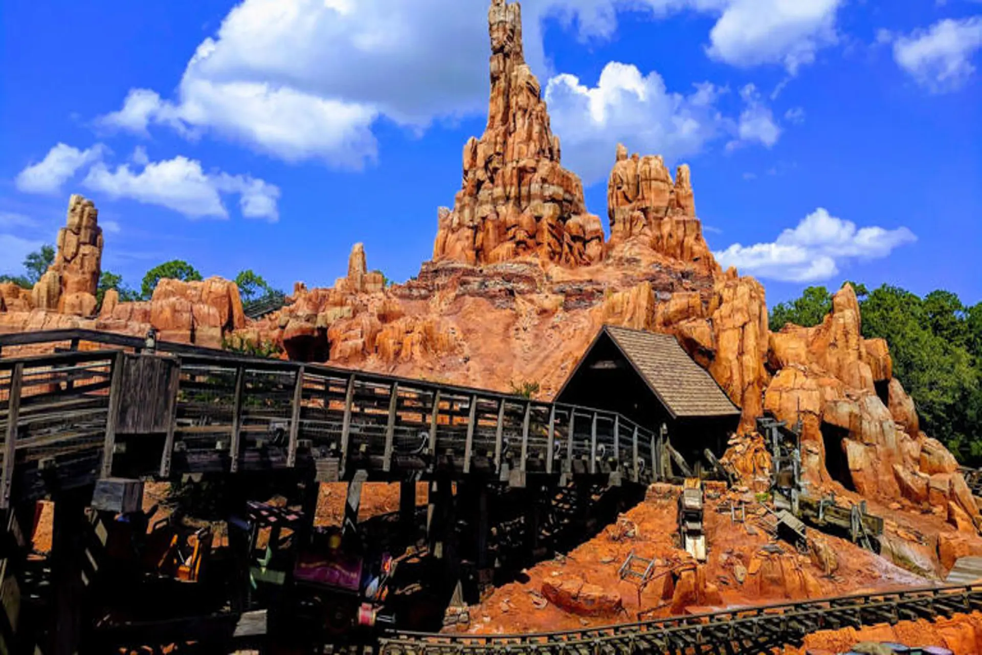 Un elemento básico de Frontierland, Big Thunder Mountain Railroad es un paseo de rápido tipo montaña rusa que ve a los huéspedes sentados en vagones de "tren" que despegan a altas velocidades, corriendo a lo largo de las pistas y a través de túneles.